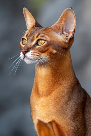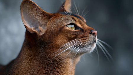 Close-up Portrait Showcasing an Adorable Abyssinian Cat with Striking Eyes Against Gray Background