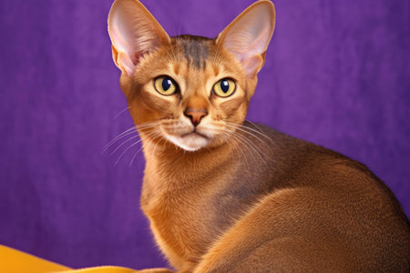 A stunning portrait of an Abyssinian cat with a warm ruddy coat and almond-shaped amber eyes against a solid purple background.