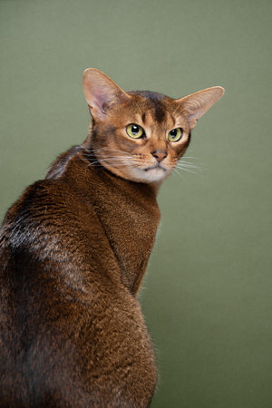 abyssinian cat looking back over shoulder portrait on green background