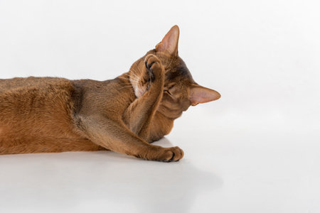 Abyssinian cat on white table with white background lift paw and one eye closed