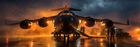 Huge logistic cargo military plane used for strategic bombing during a special operation at airforce support at war zone.