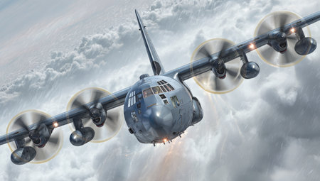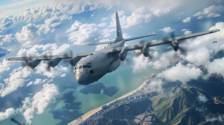portrait of hercules c-130 military aircraft in sky on mission