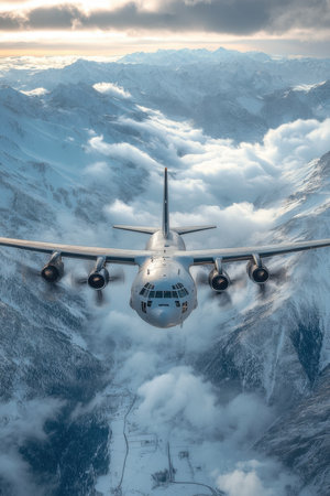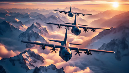 A formation of military transport planes flying over mountains, Ai generated image