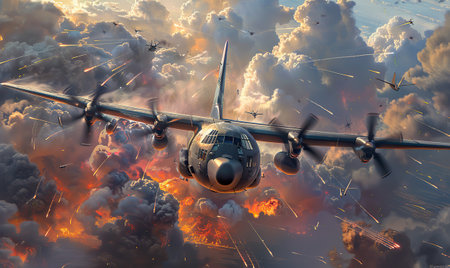 A military aircraft amidst explosive dogfight with clouds & fiery blasts. Generate AI