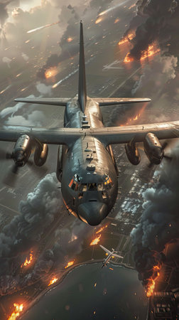 3D illustration of a military transport aircraft in the sky with smoke