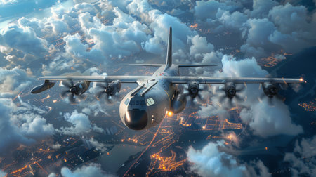 A large military aircraft soars above layers of fluffy clouds during sunset, casting a striking silhouette against the vibrant sky. The powerful engines are visible, emphasizing the craft's imposing presence in the air.