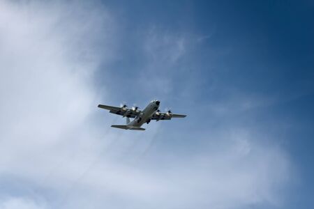 Military aircraft plane four engine low flying pass blue sky public event summers day