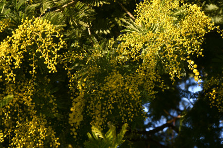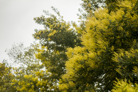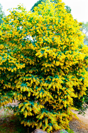 A mimosa tree with bunches of its fluffy delicate flowers and buds at the beginning of flowering in February.