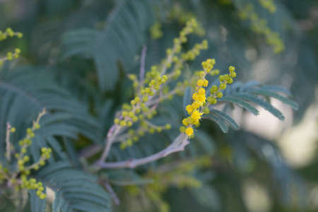 Close-up of beautiful blooming mimosa flowers in forest park.