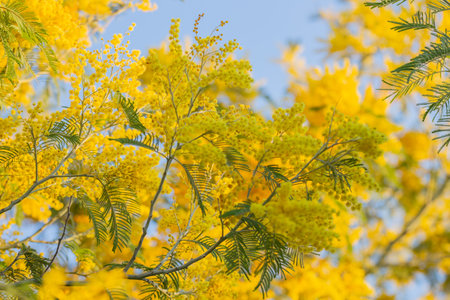 Yellow flowers and green leaves of mimosa tree with some flowers in sharp focus and others blurred