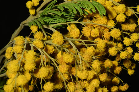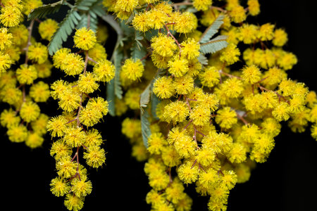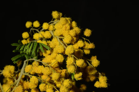 Beautiful mimosa flowers on a black background. Close-up.