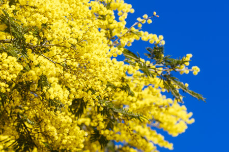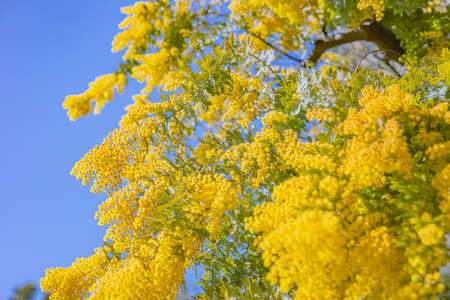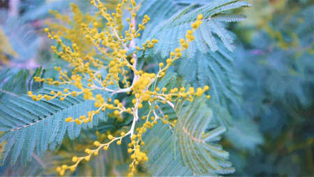 Flowering mimosa tree. Mimosa blooms. Selective focus. The flowery branch of mimosa is offered to women on March 8th for the International Women's Day.