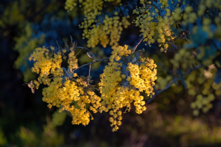 Close-up of vibrant yellow mimosa blossoms on green branches, bathed in warm sunlight, symbolizing spring and new beginnings.