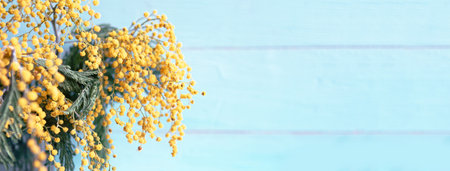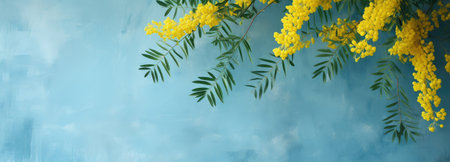 Spring flat lay. Stylish mimosa flowers composition on blue background. 8 march. Happy womens day and Happy Mothers day greeting card. Beautiful blooming mimosa pattern