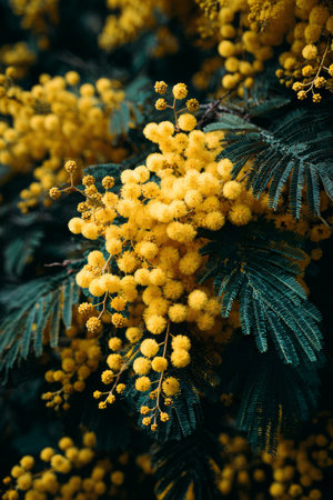 A vibrant display of yellow mimosa flowers blooms against lush green foliage, capturing the essence of spring on a sunny afternoon in nature.