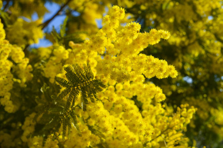 Bright yellow flowers of mimosa with green leaves, shot close-up.