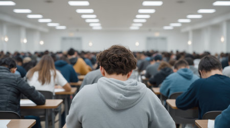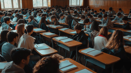 A large group of students is seated at desks during an exam in a bright and modern classroom. The image captures their concentration and atmosphere of academic evaluation.