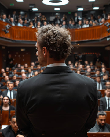 Graduate on stage facing auditorium in academic gown and cap. concept of achievement, education milestone, graduation ceremony.
