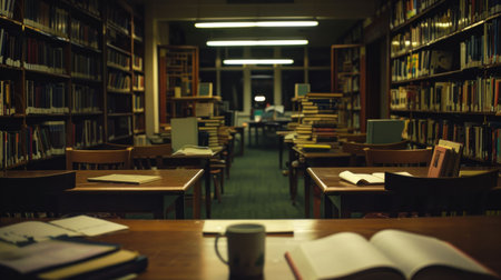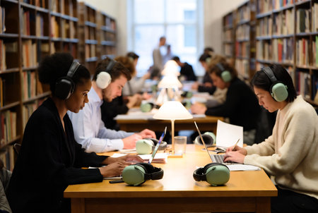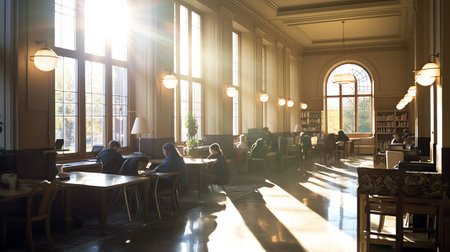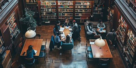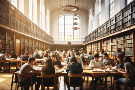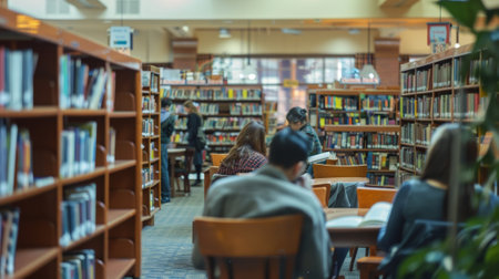 Defocused background image of a busy library with students tered across tables and desks absorbed in their books and research materials. The shelves of books in the background add