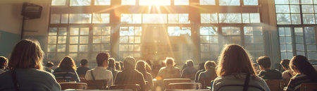 The image depicts an epic scene of a high school classroom during a final exam with students deeply engrossed in their studies The dramatic sunlight beam shining through the large windows creates a