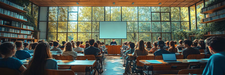 A bright spacious university lecture hall, natural light streaming through large windows, students immersed in a lecture while a projector displays slides