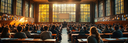 A realistic depiction of a university lecture hall, with students focused on learning, the professor delivering knowledge, creating an intellectual engaging atmosphere, banner