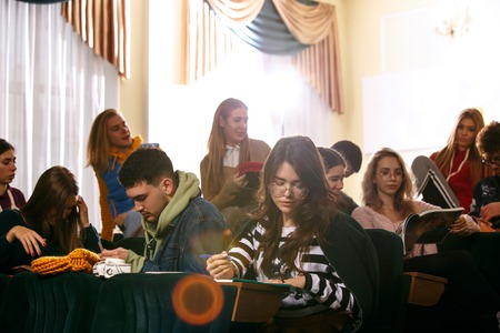 The group of cheerful students sitting in a lecture hall before lesson. The education, university, lecture, people, institute, college, studying, friendship and communication concept