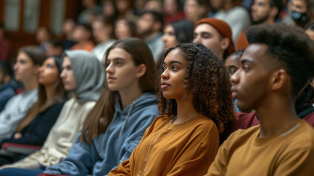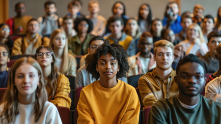 A diverse group of college students engaged in a lecture in a university classroom. Concept Education, College Life, Classroom Environment, Diversity, Student Engagement