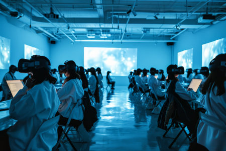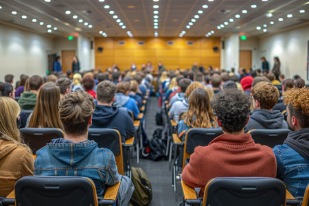 A large audience attentively listens to a presentation in a well-lit lecture hall. The attendees are focused on the screen, absorbing knowledge during this educational event. The scene captures a moment of collective learning and intellectual engagement in a modern academic setting.