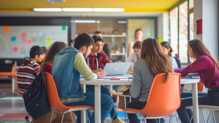 A diverse group of students engages in a roundtable discussion in a contemporary classroom.
