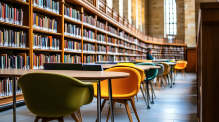 A vibrant library scene showcasing colorful chairs and tall bookshelves filled with books, creating a warm and inviting space for study and contemplation.