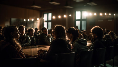 Large group of people sitting indoors, watching a performance on stage generated by artificial intelligence