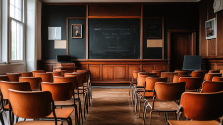 A cinematic wide shot capturing the scale of an empty, traditional university lecture hall. A large