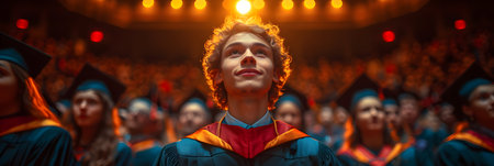 Graduates wearing caps and gowns experiencing a commencement event, celebrating academic achievement and success in a grand hall with confetti falling