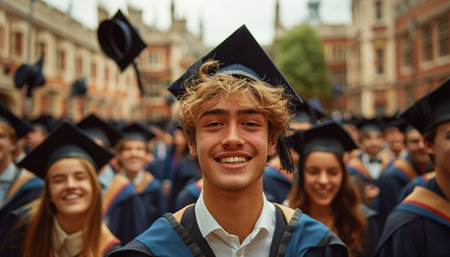 Students throw caps in the air, congratulating graduation each other. It is s a moment of success, unity, and university memories.