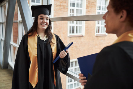 Caucasian young woman, wearing graduation cap and gown, smiling while holding diploma folder and talking to another fellow male student in academic regalia inside university building