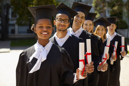 Multi-ethnic group of happy young people wearing graduation robes standing in row and looking at camera
