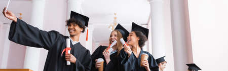 Smiling multiethnic graduates with paper cups taking selfie, banner