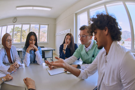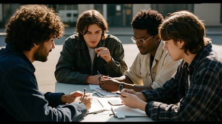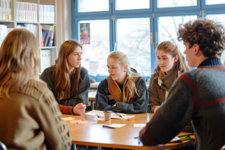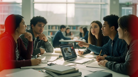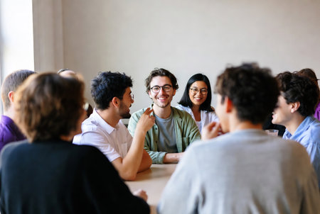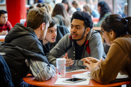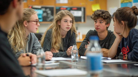 A diverse group of students sitting around a table engaged in a lively discussion, A group of diverse students engaged in a lively discussion
