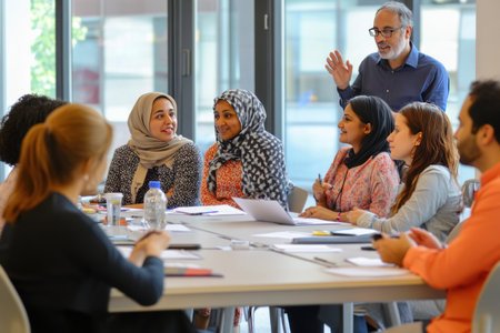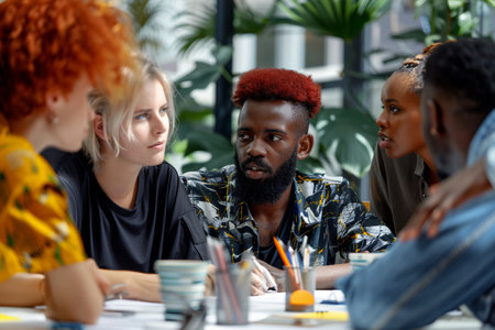 A diverse group of people sitting around a table, engaged in a collaborative discussion or meeting, A group of diverse individuals collaborating on a project