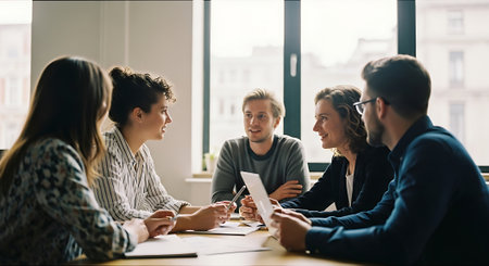 Wide shot of multiethnic business team talking at meeting table in office conference room, brainstorming in co-working space with large window. Project leader woman talking to colleagues. ai generated