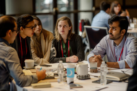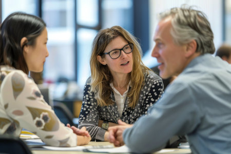 A group of professionals sitting around a table, engaged in discussion and brainstorming during a meeting, Group of professionals discussing ideas in a breakout session