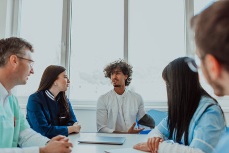 A diverse group of people are gathered around a table with laptops, engaged in deep discussion and collaboration on various projects and ideas. Generative AI