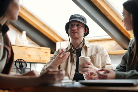 Young confident businessman with cup of coffee talking to female colleagues or explaining them something at break in office