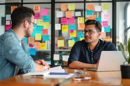 Two business people discussing in office setting. Team leader sits beside new team member at workplace and explains project details to new colleague