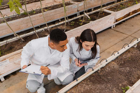 Overhead view of interracial botanists holding clipboards near ground in greenhouse
