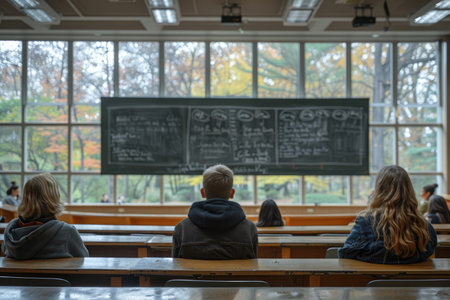 Diverse group of college students attentively listening to a lecture in a university classroom. Concept University Life, Classroom Setting, Diverse Students, Lecture Session, College Education