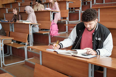 Wide angle view at diverse group of students taking exam while sitting at desk in school auditorium, copy space