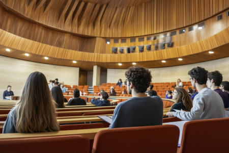 A large group of students is attentively listening to a lecture in a modern university auditorium. The atmosphere is focused and collaborative as different topics are discussed.