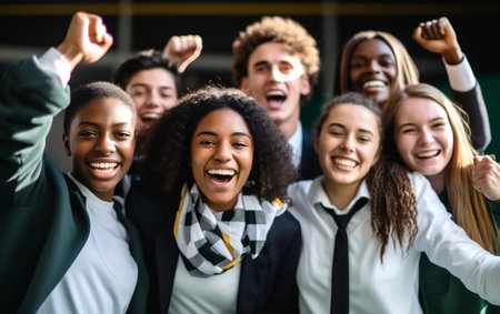 Group of young students raising arms and cheering together, celebrating their academic achievements